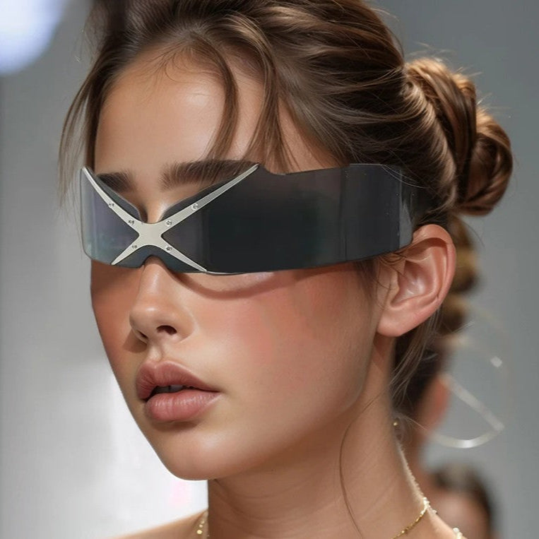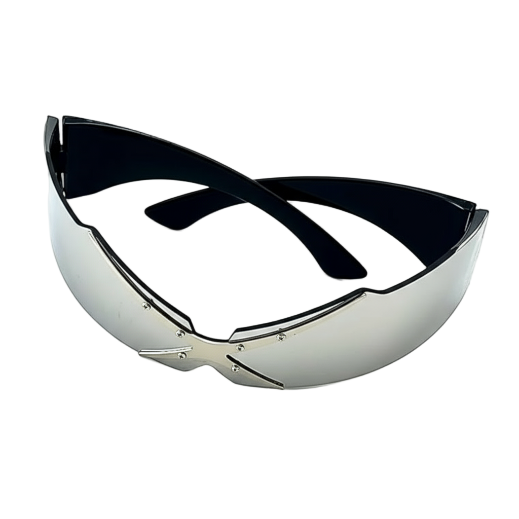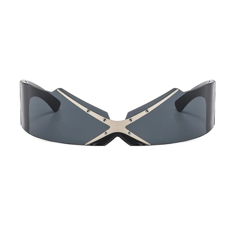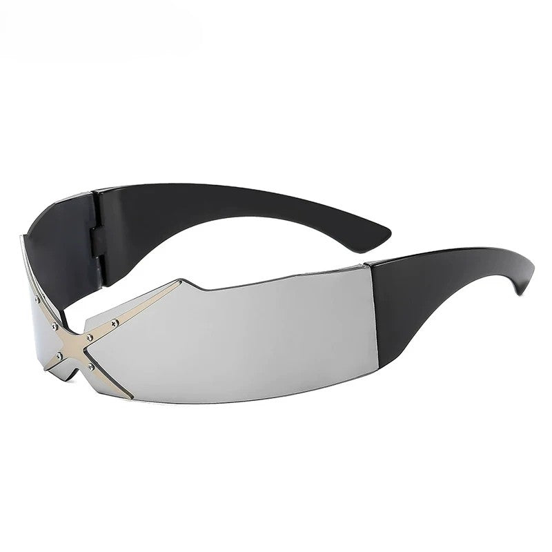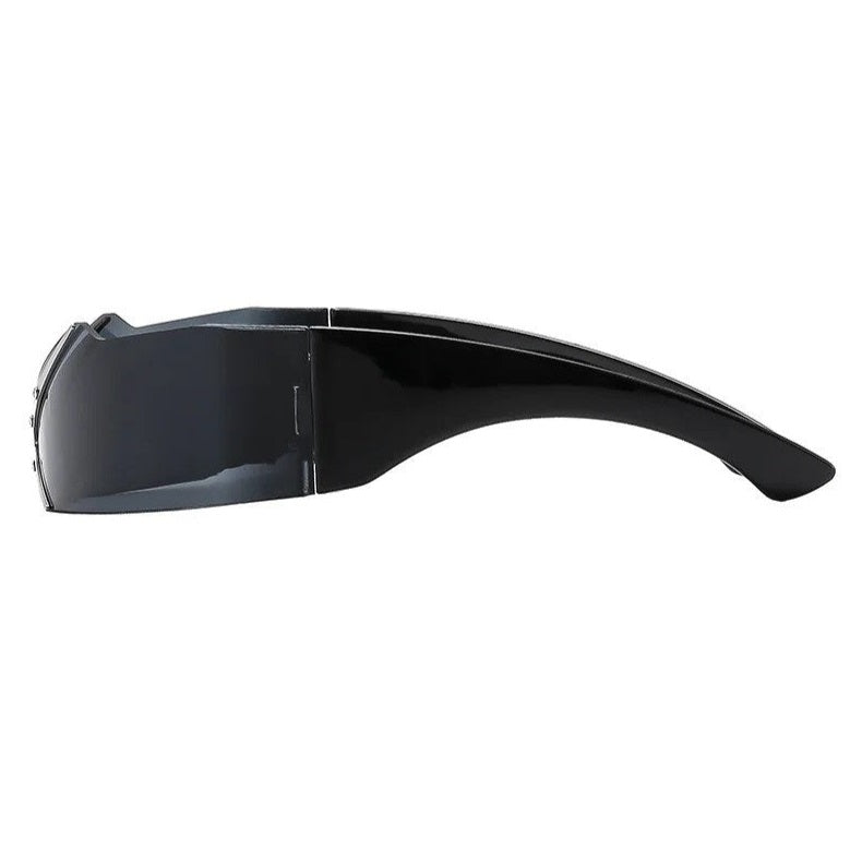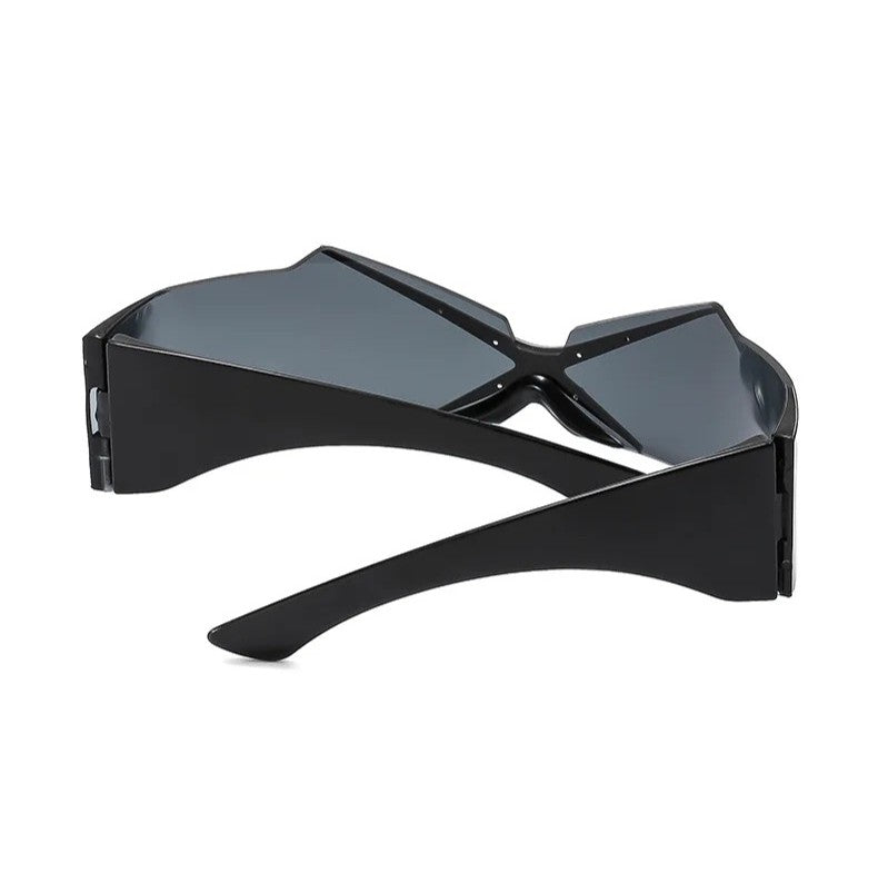 Embrace the retro future with these Y2K punk rimless mask sunglasses, a trendy wrap-around shade for a bold fashion statement.